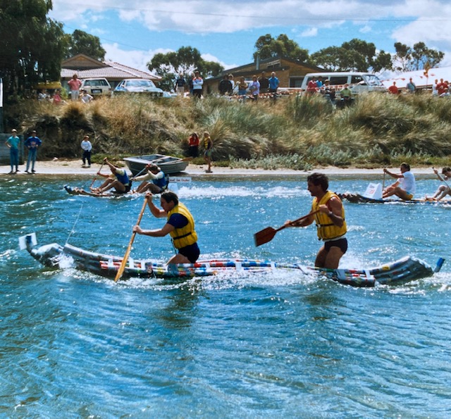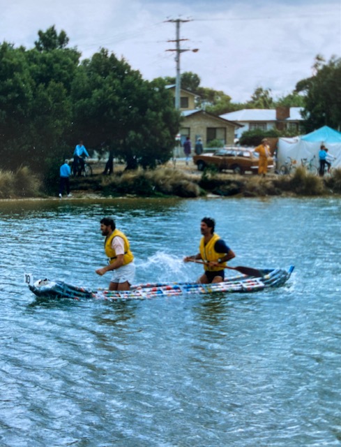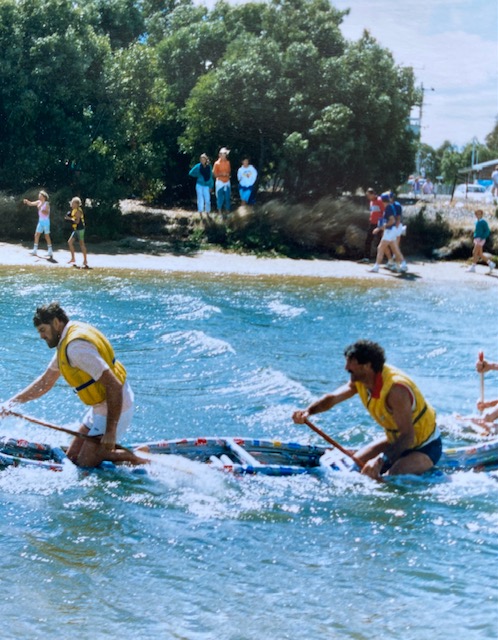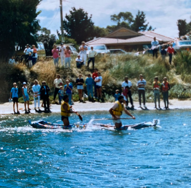 Bill and Nige stroked rhythmically riding the waves in their craft,