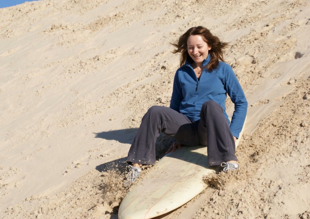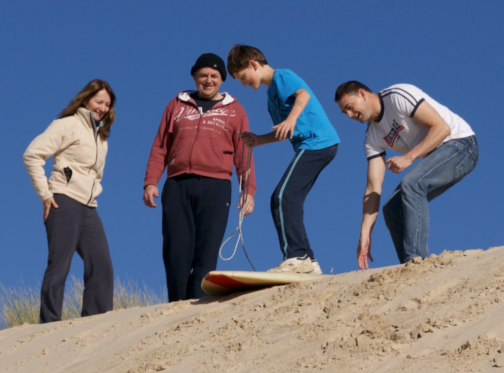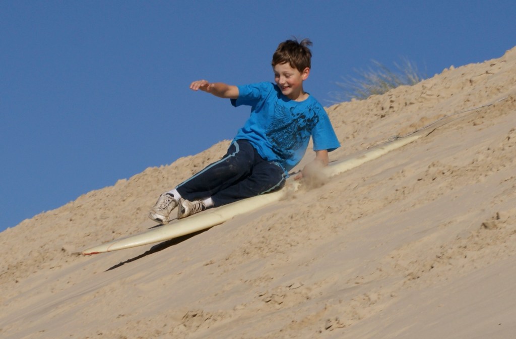 Down the dune, two girls, three boys,