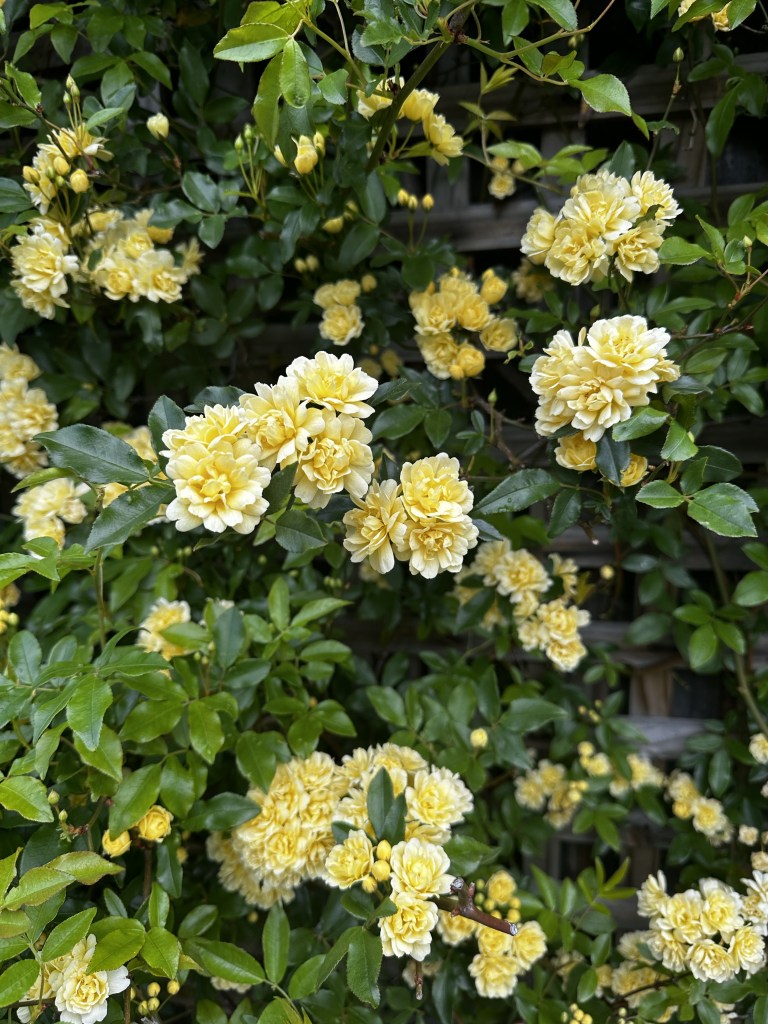 The banksia rose is on display, A welcome sight from day to day, As blooms extend across the fence. The wisteria gives the sense, Although enduring wind each day, That spring has finally come to stay. The roses show their bright new blooms, Relief from winter’s greyish gloom.